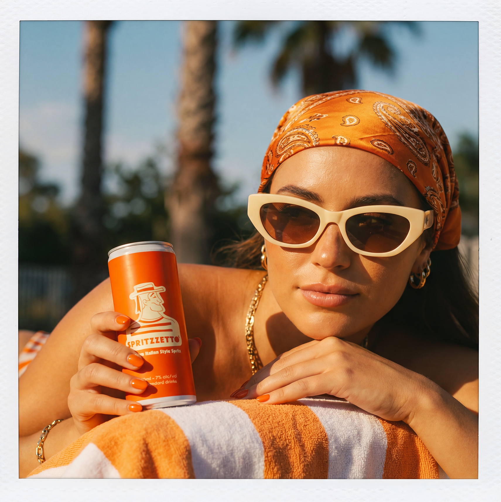 Every image was created in a Polaroid-style format with soft white borders, reinforcing an analog, sun-faded authenticity. We wanted to highlight Spritzzetto's heritage, so created quintessentially Italian settings - Amalfi coastlines, Venice canals, poolside terraces, and citrus groves - styled with retro props, linen textures, and vintage swimwear to evoke a long, unhurried summer afternoon.